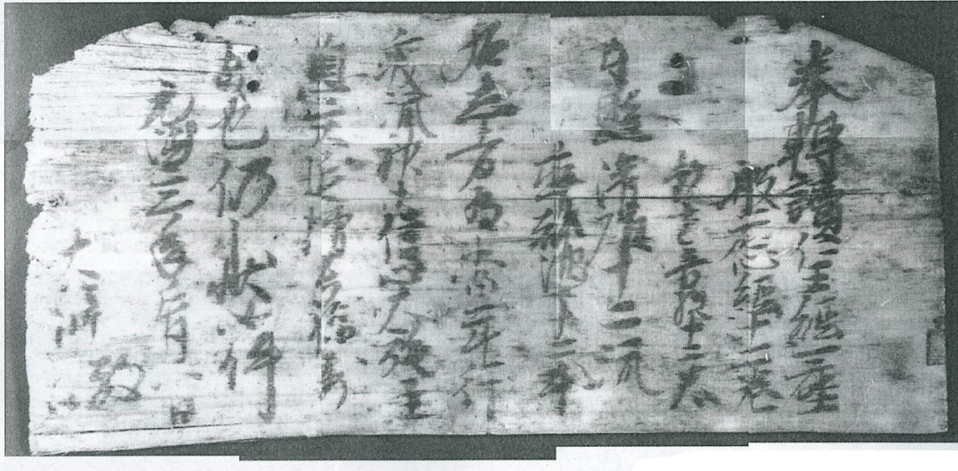 今回ご紹介する逸品は、彦根市松原内湖遺跡で出土した「巻数板(かんじょういた)」です。鎌倉時代末のもので、平成26年度の調査で出土しました(写真1)。