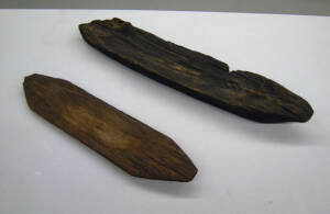 木で作られたおもちゃのように見えるこの遺物は、高島市上御殿遺跡から出土した船形代です。これは、古代の祭祀などに使用された道具のひとつとして知られています。弥生時代から作られており、木製の祭祀具のなかでは古くから存在するものです。この遺物は、板材の両端を尖らせて形を作ったものや、角材や半截した丸木をくり抜いて立体的な形を作ったものなどがあります。立体的なものには、くり抜いただけの丸木舟のような形のものもありますが、丸木船にいくつかの部材を組み合わせた準構造船の形をしたものなども作られています。なかには、帆柱の存在を想定できる穴があけられたものなどが見つかっています。