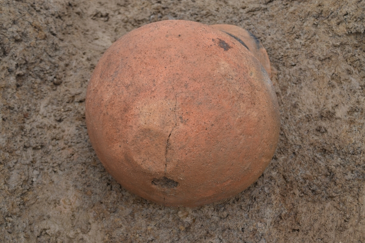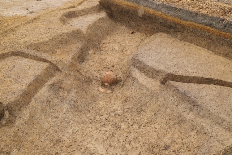 古墳には直径22mを測る円墳1基と一辺5~15mを測る方墳15基がみつかっています。これらの古墳には亡くなった人を埋葬した墳丘は残っておらず、その周囲を囲む溝(周溝)だけが確認できました。そのうち、一辺5m以上を測る12号墳とした方墳の周溝からは、大きな壺が横倒しになって出土しています(写真2)。破損している部分があるものの、大きくは壊れることなく土の中に埋まっていました。