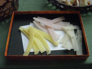 あげるとまだまだ・・・。このように広く知られた「醒井餅」。作り方や形状については、地方の名物料理をまとめた江戸時代中頃の『料理山海郷』に「近江醒井餅」として、「極上の米で餅を作り薄く切って藁であんで陰干にしたもの」と記されています。また江戸時代中頃の『近江輿地志略』には、「紅黄白の片餅大さ堅四五寸幅四五分厚さ一分に及ばず甚だ薄し」「今短冊餅とて幅一寸六分許長五寸許黄白赤の三色にしてこれを売る専ら醒井餅という。これ百年以来の事也。」と記されています。これによると、幅4.8㎝×15㎝で厚さ3㎜未満、あるいは巾1.2~1.5㎝×長さ12~15㎝ほどの大きさの薄い片餅(薄く削った餅)で、赤・黄・白の3色があったことになります。