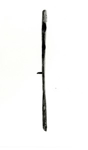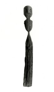3号木偶は全長57.4cmで、樹種は唯一モクレン属の広葉樹です。頭部から下は連続して作られていて、末端は尖っています。頭部は六角形をしていて、顔面には左目が掘り込まれ、右目は焼き鏝で押し付けられたように焼焦げています。