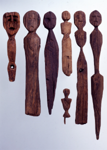 湯ノ部遺跡の木偶は、小さい順に1~4号木偶とされています。1号木偶はヒノキの一木で作られていて、全長は19.2cm、頭部・胴部・腰部・脚部からなります。顔面には目と口がうっすらと彫りこまれています。また、右肩から左腰にたすきを掛けたような掘り込みがあり、胸部には貫通していない穴があります。脚部は1本で表現されています。この木偶には、頭頂部や肩・腰に赤い彩色が残っていましたので、作られた当時は全体に彩色が施されていたと思われます。こうした特徴は、古墳時代の埴輪の巫女に似ています。