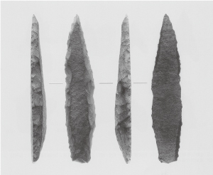 関津遺跡で出土した角錐状石器は、先端部が僅かに欠損していますがほぼ完形品で、風化も進んでいませんでした。石材はサヌカイトで、長さ7.04㎝・幅1.46㎝・厚さ0.75㎝・重さ8.4g、細身で鋭い先端をもち、丁寧に仕上げられています。