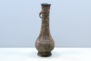 その後の整理調査で、この壺は双耳長頸瓶というもので、耳の部分は龍が口を開けて舌を伸ばした表現になっていることから、龍耳瓶とも呼ばれるものであることが分かりました。さらに、この銅器はいわゆる「倣古銅器」で、中国の宋・元・明代に古代の銅器を模倣して作られたものだったのです。そして、この館に住む人物は、「唐物(中国からの輸入品)」を入手できるルートを持ち、こういったものを座敷飾りなどとして珍重することを知っていたことがわかったのです。