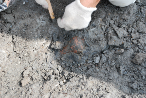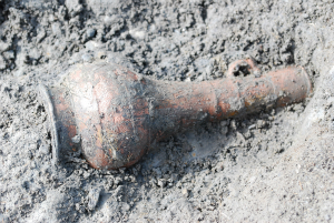 遺跡を調査していて最もお目にかかる遺物は土器類です。また、遺跡によっては石器や瓦類が最も多く出土する場合もあるでしょう。しかし、金属製品や木製品は、腐ったり錆びたりしないための良い条件に恵まれなければ出土しません。中でも「銭」や「鉄釘」以外の金属製品にはなかなかお目にかかる機会はないのです。「銅鏡」や「銅鐸」など、青銅や銅製の良い遺物に一度は現場で巡り会いたいなあと思っていた私にも、チャンスが巡ってきました。