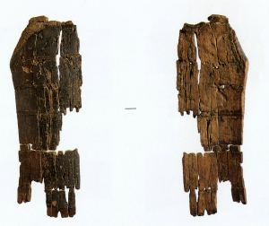 そんな時は、復元品を作ってしまえ! 手先の器用な調査員の一人が、その後、復元品を作成しました。これによって、あれこれと装着を繰り返してみた結果、身長150㎝ぐらいなら、前胴としてもほとんど動きの妨げとならないこと。逆に後胴とした方が、腰の動きなどが苦しくなる可能性があることなどがわかってきました。今ではこれを前胴と決定し、木製短甲には木製短甲独自の形状があったと考えるようになりました。