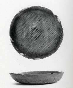 ここで逸品として取り上げるのは「瓦器」です。瓦器は読んで字の如く「瓦」の器にふさわしく、器の表面が瓦のように燻されて黒光りしています。そして、内外面に暗文とよばれる幅1~2㎜程度筋状のミガキが施されています。これは燻された効果も相まって、光の当たり具合でキラキラと金属器のような光沢感を醸し出します。器形は椀と皿があり(写真1・2)、11世紀中頃から後半にかけて近畿地方で出現します。器形などの特徴から大きく旧国名にちなんだ「大和」、「樟葉(摂津)」、「和泉」の3つ型式が代表的で、近江で出土する瓦器は、この中の大和の影響を受けたものです。11世紀後半に大津市南部(関津遺跡など)、湖東南部(東近江市旧蒲生町)で出現し、13世紀代まで確認されます。先述のように近江の瓦器は、大きな枠組みとして「大和型」瓦器椀として認識できるものですが、細部で異なる個体がみうけられることが問題となっていました。しかし、近年、大津市南部、甲賀市域の発掘調査事例が増加したことにより、近江でどのように瓦器が出現し、展開したのかが明らかになりつつあります。結論からいえば、大津市南部地域は出現から消滅まで「大和型」そのものが確認され、近江における「大和」的な地域で人・モノが大和から来ていたと推測されます(調査員のおすすめの逸品No.57で関津遺跡出土の瓦器については紹介されています)。一方、甲賀・湖東南部地域は当初「大和型」を真似るのですがそれが続かず、最後は「大和型」の亜流である伊賀型と呼ばれる瓦器が展開していくことが分かりました(写真3の中央付近の瓦器)。このように近江の瓦器の動向をみるだけでも、狭い地域内に差があることが明らかです。