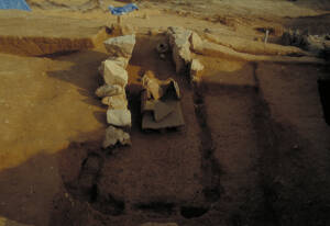 陶棺は、横穴式石室を主体部とする7号墳の石室内で見つかりました(写真2)。この陶棺は、四柱式家形(しちゅうしきいえがた)陶棺と呼ばれるタイプです。発掘調査時には、すでに石室奥壁側の半分や棺の蓋が破壊されていましたが、陶棺の中からは鉄鈴2点などが見つかりました。