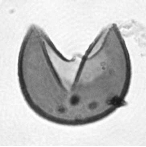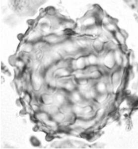 こうした場所を発掘すると水分を含んだ粘土層に当たります。粘土層には、当時の花粉化石、珪藻化石などが含まれています。花粉化石は、現代病で誰もが知っている花粉症で有名な花粉が化石化したものです。珪藻はガラスでできた体を持った単細胞の藻類で、魚のえさなどになります。この珪藻が化石になったものが珪藻化石です。