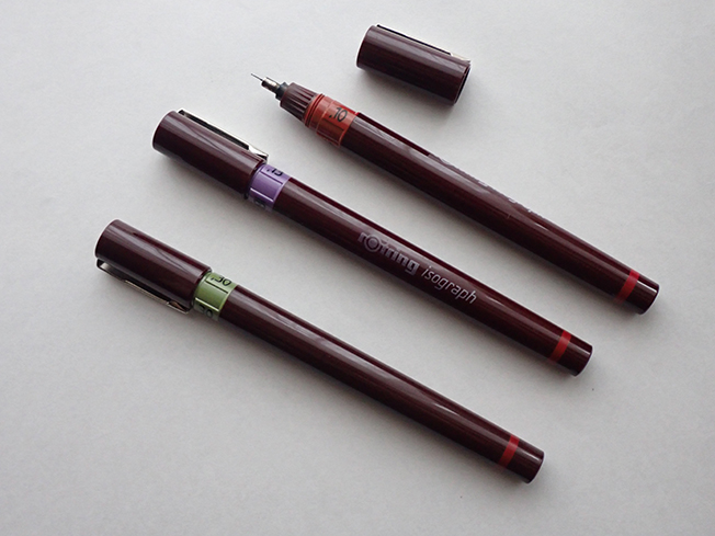 決まった太さの線が必要なら、安価でどこにでも売っているボールペンやミリペンを使えば良いと思うかもしれません。しかし、細すぎてボールペンでは引けない線が図面で用いられること、ミリペンはペン先がつぶれやすく、線の幅が変わったり本体が使えなくなったりすることから、トレースでは製図ペンが用いられます。