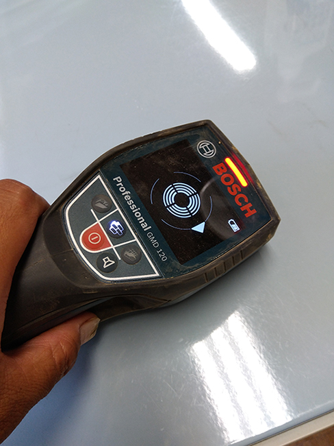 「金属探知機持ってきましたので、置いていきますので使ってください。がんばってください。」と先生。借りっぱなしもなんなので、すぐに職場に同じものを用意してもらい、金属反応探査をすることになったのでした。(写真1)