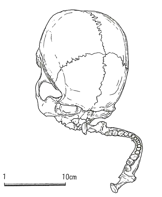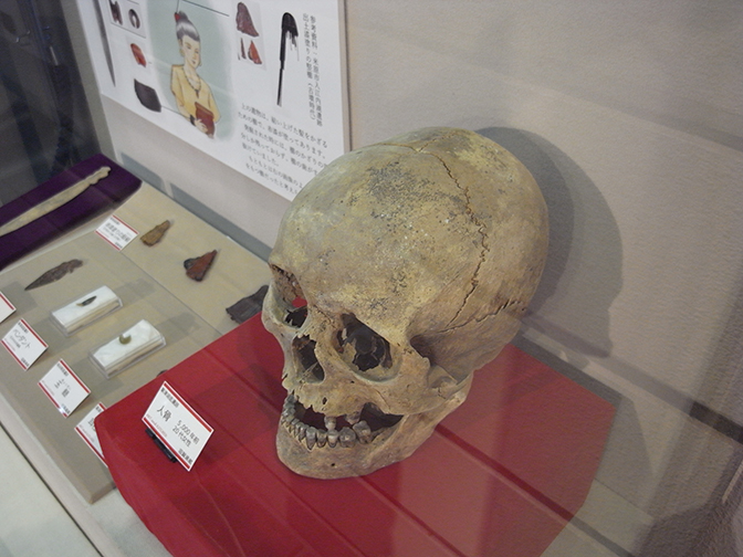 なお、第3貝塚からは、そもそもヒトの骨はほとんど出土せず、ほかにも墓穴のような遺構は見当たりません。この頭蓋骨の周辺も5㎝ほど浅く凹んでいましたが、墓穴のように掘り凹めたものではなく、この人骨は「埋めた」ものというより、「置いた」ものというべきものとなります。