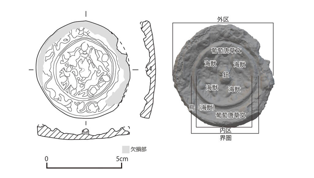 以前、このコーナーで大津市の東光寺遺跡で出土した小型海獣葡萄鏡(こがたかいじゅうぶどうきょう)について紹介しました(逸品No.330)。今回は自分自身が関わった調査で出土した小型海獣葡萄鏡を紹介します。