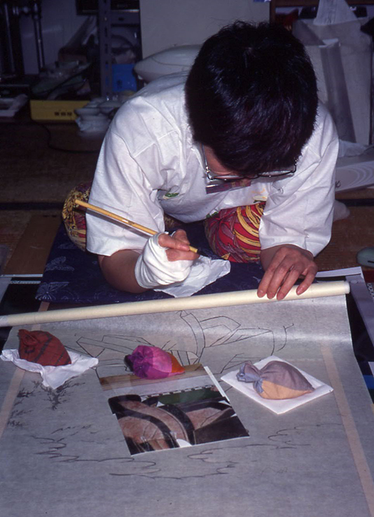 模写の作成でまず取りかかるのは、下図作成です。原本と同じ絵を描くためには、「上げ写し」と呼ばれる特殊技術が用いられます(写真5)。原本(現在は原本を危険にさらさないため実物大写真を使用)の上に薄い和紙を敷き、これをめくって原本をじっと見つめ、その残像が瞳と脳裏に残っている間に紙を下ろして少しずつ写し取っていく方法で、時間と手間と集中力が求められます。