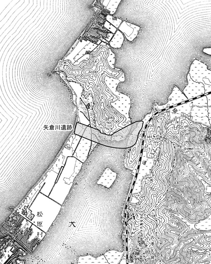 矢倉川遺跡は米原市と彦根市の境に位置し、縄文時代から平安時代にかけての遺物散布地として周知されています。本格的な発掘調査は行われていませんでしたが、縄文時代早期の土器などが採集されていました。遺跡の範囲は東西に細長く、現在はその中央を人工水路である矢倉川が西流して琵琶湖に流れ込んでいますが、かつては松原内湖(まつばらないこ)や入江内湖(いりえないこ)といった内湖の岸でした(図1)。