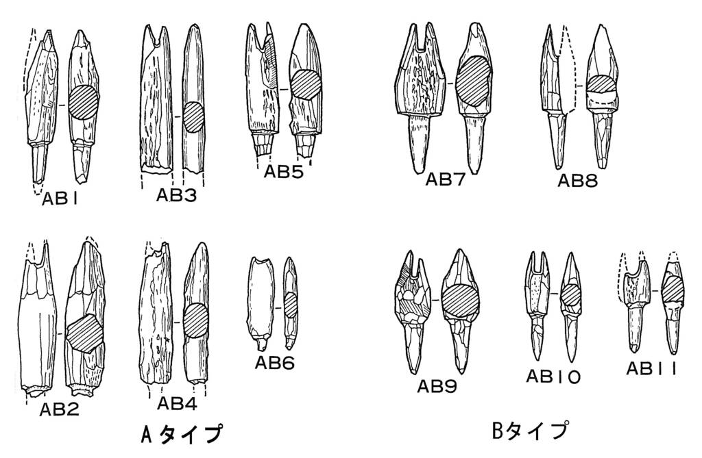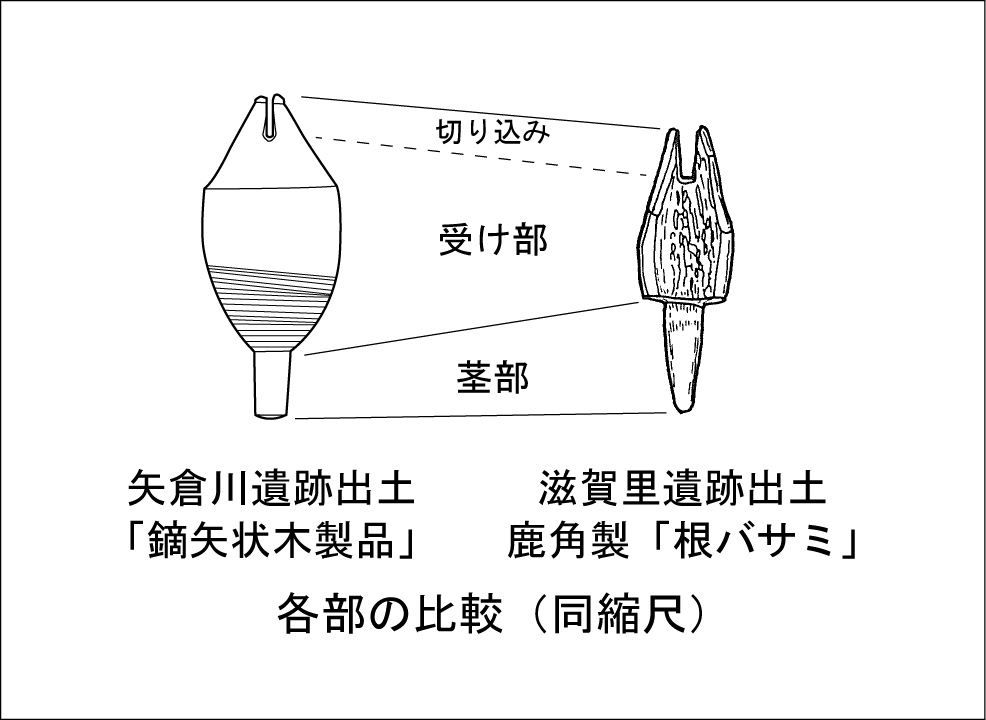 鹿角製「根バサミ」は湖西線調査時に貝塚から出土しました(写真2・図3)。用途は、「鏑矢状木製品」と同じく、石製の鏃を取り付けて矢柄にはめ込むものと考えられています。滋賀里遺跡のものは、短かい茎部に対して受け部が細長いAタイプと、長めの茎部に受け部の幅が広いBタイプに分けられています。切り込みの幅は3~4㎜で、全長はAタイプの方がやや長いようです。11点ずつが報告され、出土層位からAタイプが古くてBタイプが新しいと位置付けられています。寡聞にして類例はあまり知りませんが、近畿地方では奈良県橿原遺跡などでも縄文時代晩期の根バサミが出土しています。
