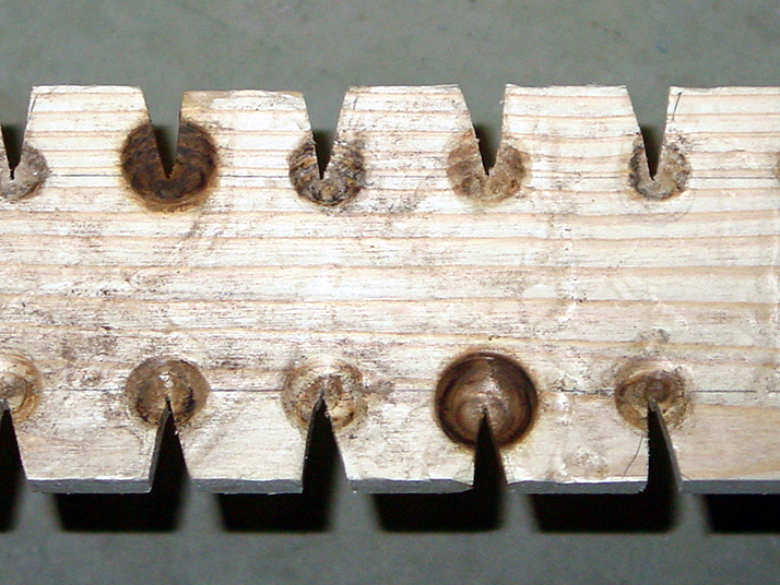 一方、火錐臼はたくさん出土しています。主に弥生時代から古墳時代のものが多く、全国で350点以上確認されています。滋賀県だけでも約30点出土していて、その8割以上がスギまたはヒノキを用いていました。形状は、幅3㎝前後、厚さ1㎝前後の角材で、直径0.5~0.8㎝程度の穴が数個、一方の長辺に並んでいます。穴は貫通せず底が焦げていて、長辺から穴の中央にかけてV字形の切込みが入っています。実際に体験学習でやってみるとわかりますが、このV字形の切込みがないと火を起こせません(写真2)。火錐杵の先端を穴に差し込み、連続して回転させて火を起こすのですが、摩擦によって火錐杵・火錐臼双方の木材が削れ、その木屑が摩擦熱で発火します。この時、V字形の切込みに木屑が溜まり、火が付きやすくなるのです。