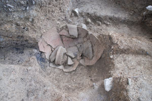 この時出土した遺物は、平成20年度に整理調査を実施しました。埋甕遺構からみつかった2点の甕のうち1点については、破片がほとんどそろっており、ほぼ完全な形に復元することができました。