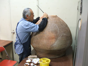 復元作業は、ばらばらになった破片をセメダインで接合し、欠落部分には、石膏(せっこう)を補填材(ほてんざい)として注入する方法で実施しました。破片それぞれの重量がかなりあるので、接合作業は、底部から何回かにわけて少しずつ行いました。