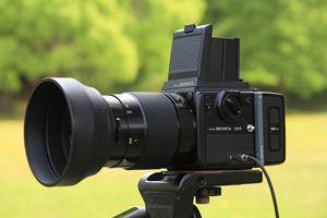 その当時は申すまでもなく、フイルムカメラの全盛期だったため、ハッセルをはじめ、フジ、ブロニカ、ペンタックス、マミヤ、ローライなどの各社から、645から6×9判にわたる数種の中判カメラが販売されており、選び出すのに一寸した苦労と楽しみがありました。文化財写真の場合、同一被写体をモノクロでもカラーポジでも撮影するので、まずはバック交換できること、館内だけでなく出張撮影も多いので、できるだけ小型であること、さらに接写性能や、デザインの良さも考慮して、結果として6×6判のゼンザブロニカSQ-Ai (マクロ110㎜F4)に落ち着きました。