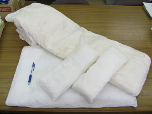 この『綿布団』は、遺跡から出土した土器をはじめ、金属器、仏像など様々な文化財の梱包に使われます。この引っ張りだこの綿布団、どうしてこんなに重宝されるのか、それは素の綿にはない利点があるからです。当然、「どうしてそのままの綿ではだめなのか」「そのまま綿を詰めたりスポンジを詰めたりしても十分に用が足せるのでは」とお思いになる方もおられるでしょう。