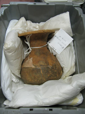梱包具と聞くと、引っ越し業者が食器等を運ぶ時に使うクッションのようなものを想像する方もおられると思います。文化財における梱包具も同じようなものです。しかし、扱うものが遺跡から出土した遺物なので、現在の食器と比較すると非常に強度が低く、壊れやすいです。そのため、梱包の際は細心の注意を払う必要があり、ちょっと変わった梱包具を使ったりします。