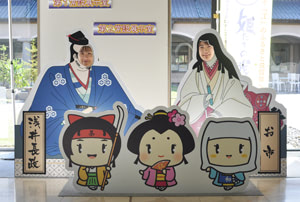 調査員の…とは少し違うかもしれませんが、私がおすすめする逸品は浅井長政・浅井長政夫人(お市)の顔出し看板です。滋賀県立安土城考古博物館には、いくつかの顔出し看板があります。中でも、大河ドラマ「お江」にあわせて登場したのが、この長政・お市の顔出し看板です。これは、おすすめの逸品№61で紹介された浅井長政・夫人像をもとに、イラスト化して作られたものです。