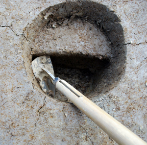 発掘調査では、直径が1mを超えるような大きな穴や直径が20cm以下で深さ50cm以上の深い穴など、いろいろな大きさや深さの遺構の掘削に直面します。こうした遺構の検出・掘削には、通常「手ガリ(両刃鎌)」や「手スコ(移植ごて)」が使われます。しかしながら、直径が小さくて深い穴は、こうした道具ではきれいに掘削できないことがあります。これまで「調査員の逸品」でも数多くの発掘道具が紹介されてきましたが、今回紹介する道具は、調査員の逸品というよりも作業員の逸品といえる道具です。