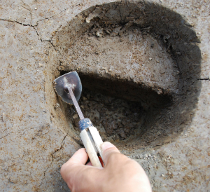 手ガリが最も活躍する場面は、遺構面(遺構が確認できる面)を削って遺構を検出したり、写真を撮影する時に遺構や遺構面をきれいにしたりする時です。当然、遺構の掘削中にも、おもに仕上げの道具として大いに役立っています。しかし、直径が20cm以下で深さ30cmを超えるような小さな柱穴などの仕上げには不向きです。なぜなら、手ガリはの柄は長さが約40cmあり、刃の部分だけでも新品の時には長さ16cm、幅6cmもあり、前述のような小さな穴では、柄や刃の長さが邪魔になってうまく使いこなせない場合が多くあります。
