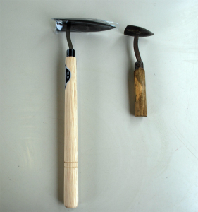 こうした穴の掘削の仕上げのためにある作業員さんが作られたのが、長期の使用で刃が減ったために廃棄予定だった手ガリの柄を短く切り、刃の部分を長さ7cm、幅4cmにカットし、小さくしたものです。この大きさですとたいていの小さな遺構の中でも自在に動かせ、仕上げにはもってこいの道具です。ついつい刃が消耗して使い勝手が悪くなると捨ててしまうのが常ですが、このように工夫をすれば特別な道具へと変身を遂げ、発掘調査に役立つ道具になるのです。この道具を使用する度に、縄文時代・弥生時代は言うに及ばず、それ以降の時代の遺物にも見られる道具の再使用・再利用がだぶって思い浮かびます。現在と比べて物資の豊富でなかった過去の時代の人々の知恵と、現代の人々の知恵のつながりを感じられずにはいられない逸品です。