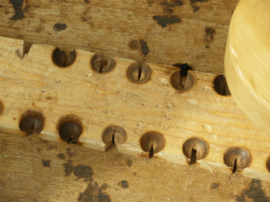 「舞い錐」は、数年前までは職員が手作りしていましたが、材料の入手が難しくなったことから、現在は市販の物を購入して使用しています(軸になる棒は取り換え可能です)。「火きり臼」は当初から手作りです。材料になる板材をよく乾燥させたあと、上面にくぼみをつけ、くぼみの先にV字形の切り込みを入れて完成です。この切り込みの入れ方によっては火種が起きにくくなってしまうので、何度も試作を重ねながら、製作しています。