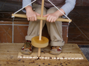 「舞い錐」を使った火起こしは、神社での儀式(神事)などに、江戸時代初頭頃から使用されるようになったようですが、小学生でも簡単に火が起こせることから、考古学体験学習のメニューとなることが多いようです。