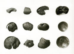 次に、これらがどれくらいの割合で食されていたのかですが、それぞれに可食部(廃棄部)も異なり、単純に個数や重量、体積で比較するのは難しいので、熱量(カロリー)で比較してみることにしました。その結果、全体の半分以上が種実類で占められ、次いで魚類が約2割、貝類が2割弱、獣類が1割程の順でした。さらに詳しくみると、種実類の中でもトチノキが7割以上と圧倒的に多くを占め、次いでヒシが2割弱、イチイガシが1割程でした。トチノキについては、たくさんの割れた種子(可食部を包むカラ)片がある一方、自然状態でみられるような種子を上回る量の幼果がないことや、炭化した可食部があることなどから、食糧として利用されたこと、また重要なカロリー源であったことがわかりました(写真4)。