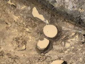 発掘調査は数か月から数年かかる時もあり、いつも青空の下でできるとは限りません。雨が降ったために足元が弛み、適切な調査が行えないと判断される時もあります。また悲しいことに、大雨が降った翌日には、調査対象地が完全に水没している場合も少なくありません。調査を進めていくためには、それら溜まった水を抜く作業が必要になってきます(写真1)。掘りかけの土坑(どこう:昔の人が何らかの目的で掘った穴)に溜まった泥水を柄杓ですくっていくと、アメリカザリガニや、ゲンゴロウ、時にはドジョウやモロコといった魚がその中に取り残されていることがあります。さらにそれらを捕食するためにサギやカラスが調査現場の中を闊歩(かっぽ)し、足跡を残していくこともあります。