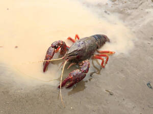 アメリカザリガニ(写真2)は特によく見かける生き物であり、土坑の中に1匹ずつ入っていることがあります。鳥に食べられてしまったものや、干上がってしまった亡骸(なきがら)を見かけることもしばしば…。住処となる巣穴を堂々と掘っている彼らを調査地の中で発見すると、調査員たちは困惑してしまいます。