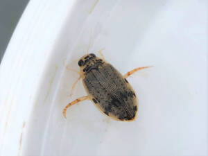 また、泥水の溜まった水面を覗き込むと、黒豆サイズの生き物がせわしなく浮き沈みしている様子を見ることができます(写真3)。図鑑で調べてみると、それらはハイイロゲンゴロウという種類の小型のゲンゴロウ類だそうです。彼らは水溜まりが干上がると、ブーンという羽音(はおと)を立てながら、近くの水場へ飛び去ってしまいます。