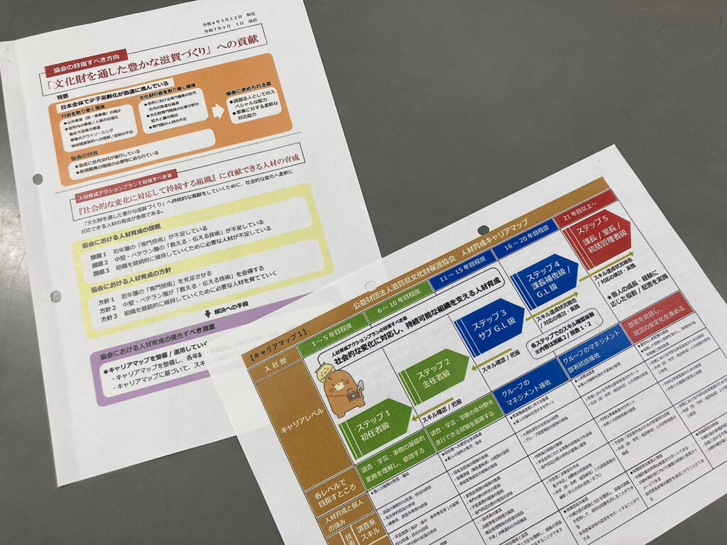 A 当協会では令和5年度に『第六次中期計画』を策定し、それを踏まえて「人材育成アクションプラン」を作成しました。いまはそのプランに基づく「キャリアマップ」を共有し、試行錯誤しているところです(写真1)。