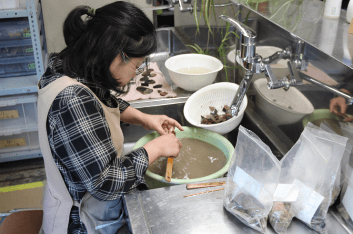 それから、例えば「土器」の場合、表面に絵や文字が描かれていたり、あるいは色が塗られていたり、また鍋として用いられたモノであれば、表面にススやお焦げが付着している場合があるので、表面の様子を観察しながら、土や汚れだけを丁寧に取り除かなければなりません。