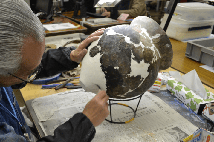 こうして実際につなぎ合わせていくと、不思議なことに、辛うじて全体の形や大きさなどは分かるものの、その大半の破片がなくなっているものが、実は意外に多いのです。そこで、一般の方にご覧頂くためには、より具体的に元の形がイメージし易いように、「復元」しておくことが良いでしょう。そこで、接合した破片に、「石膏」を補い、元の形に近い状態に「復元」するのです。