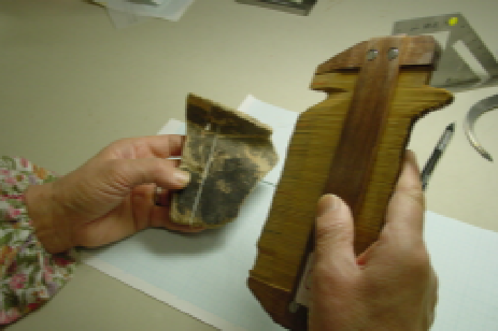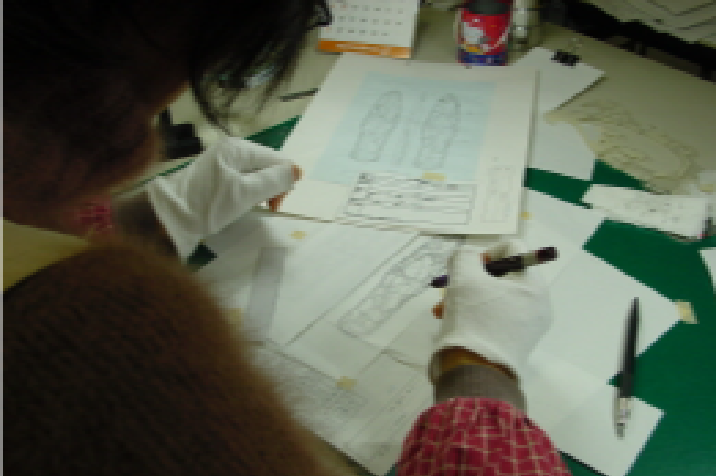 注記あるいは接合・復元の工程を経た資料は、その大きさや重さを測ったり(「計測」)、実測図を書いたりする作業を行います。「実測」というのは、遺物の寸法等を測って、同じ大きさの図を書くことを言います。そして、表面の様子や形、色などの情報を保存・提示するために、記録写真も撮ります。また必要に応じて、「拓本」(墨を使って和紙に細かい模様等を写し取る作業)や、X線写真を用いて表面観察だけでは分からない、遺物の「中」の様子を観察することもあります。