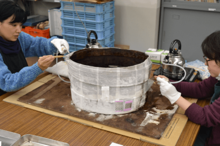 「遺物」の中には、そのまま置いておくと腐ってしまうものや壊れてしまうものもあります。例えば、乾燥すると反ったりヒビが入ったりして壊れてしまう「木器」や、逆にしっかり乾燥させておかないと腐敗(錆びる)が進行してしまう「金属器」などがそうです。