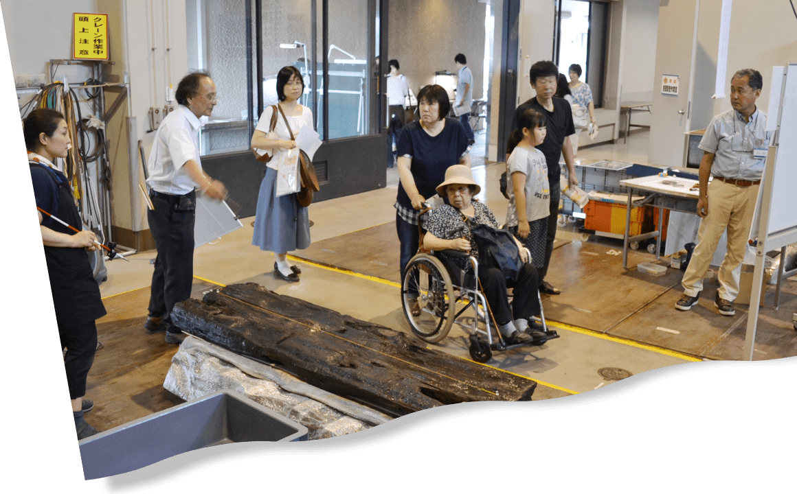 「保存処理」は、これらの遺物がこれ以上に痛まないようにするための作業です。例えば木器の場合では、木材に含まれている水分を「樹脂」に置き換えることによって、遺物の劣化を食い止めるための処理作業を行います。また、金属器の「さび」を落として元通りの形を復元し、さらに酸化しないように湿気などを遮断する工夫を施して、収納・管理することも大事な作業のひとつです。